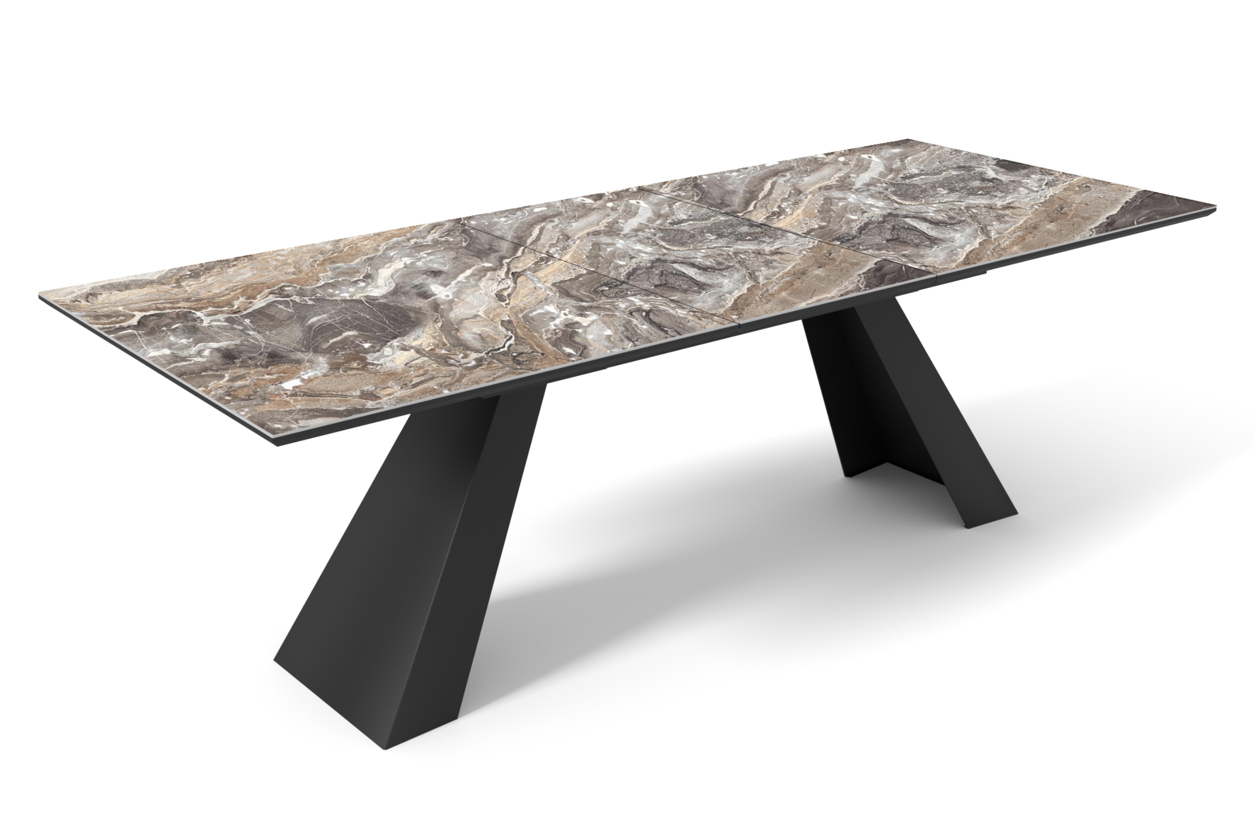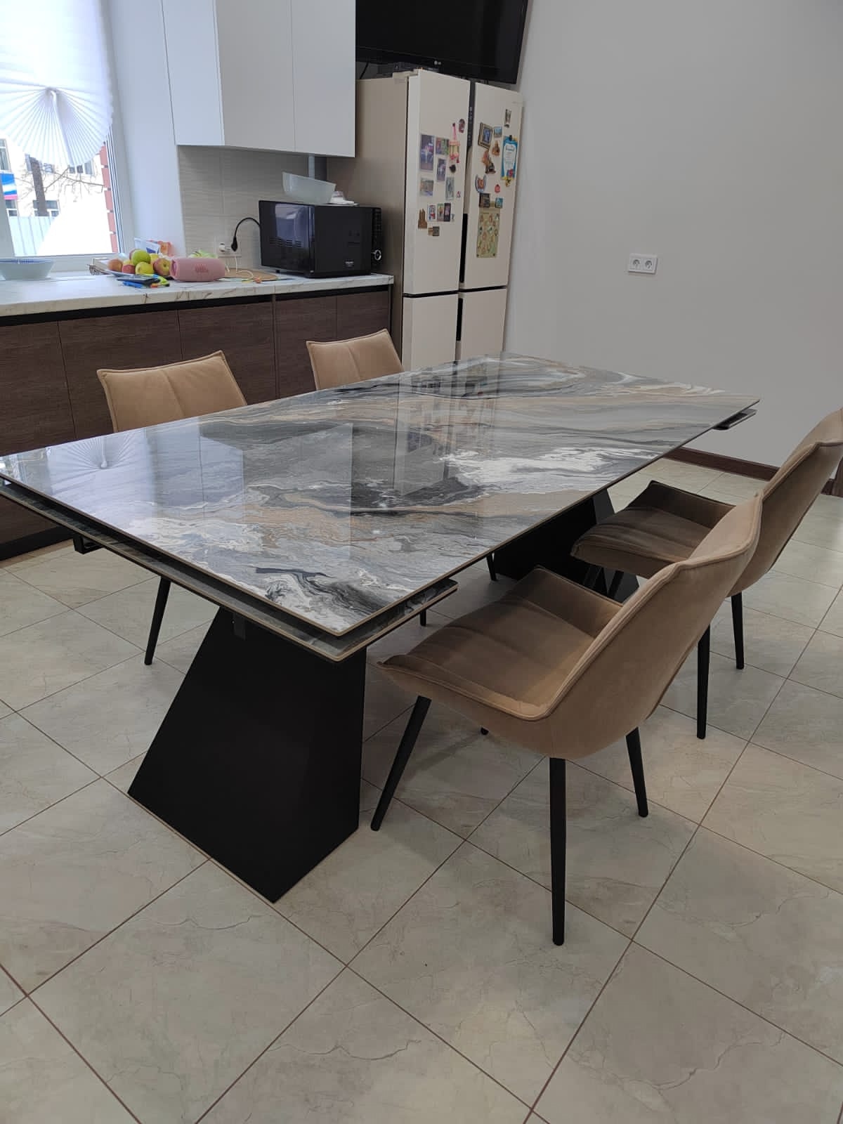 Большой и стильный стол ОНИКС. Прекрасно впишется в интерьер вашей кухни, столовой, гостиной. Стол с раздвижным механизмом автомат позволяет легко раздвигать и сдвигать одному человеку с минимальным физическим усилием. Столешница дополнительно раскладывается на 50 см в длину и увеличивает количество посадочных мест. Основа столешницы изготовлена из МДФ, верх столешницы керамика, ножки металлические Обратите внимание, что стол поставляется частично в разобранном виде. Основную сборку мы уже сделали, остается прикрепить только опору к основанию столешницы.